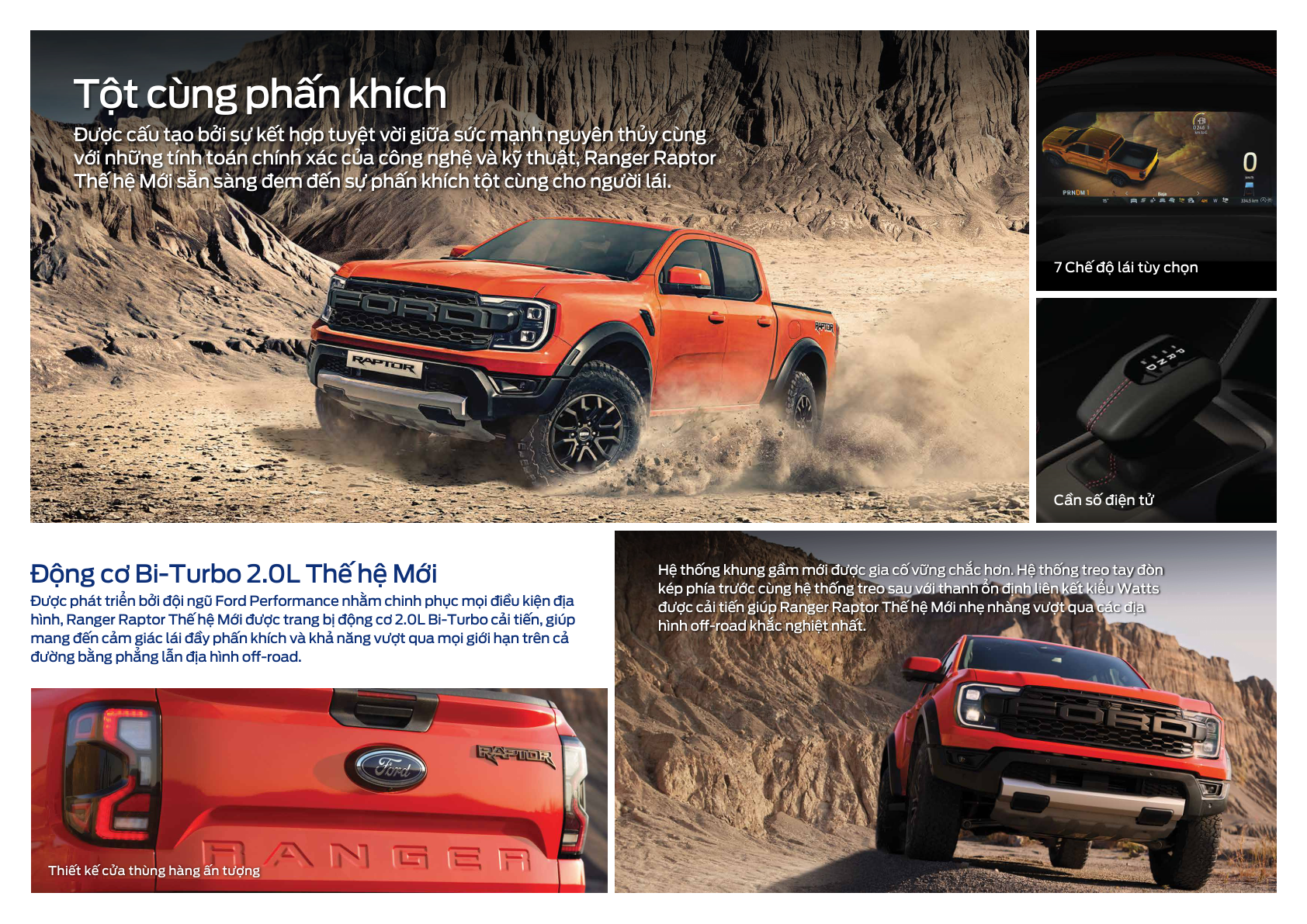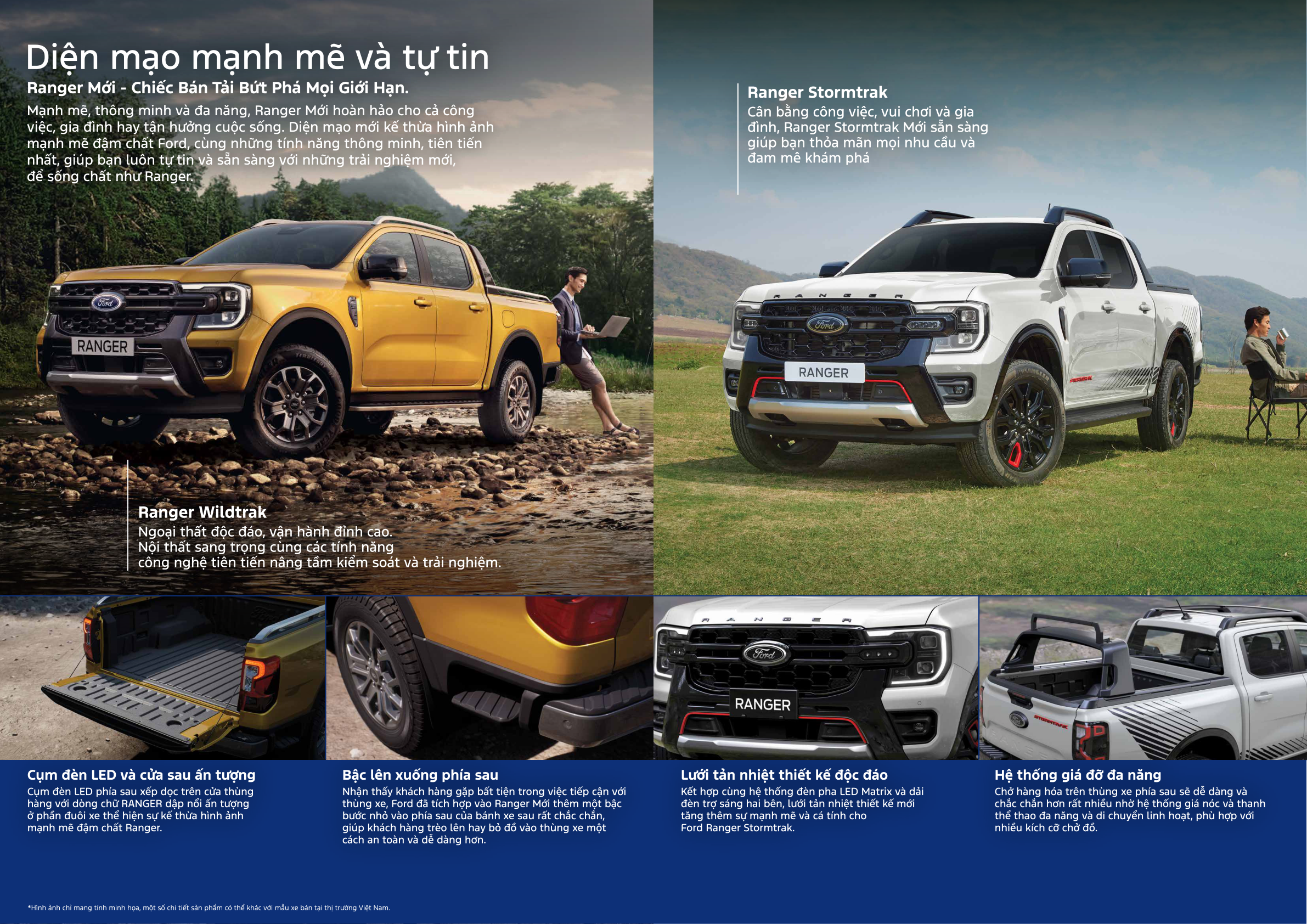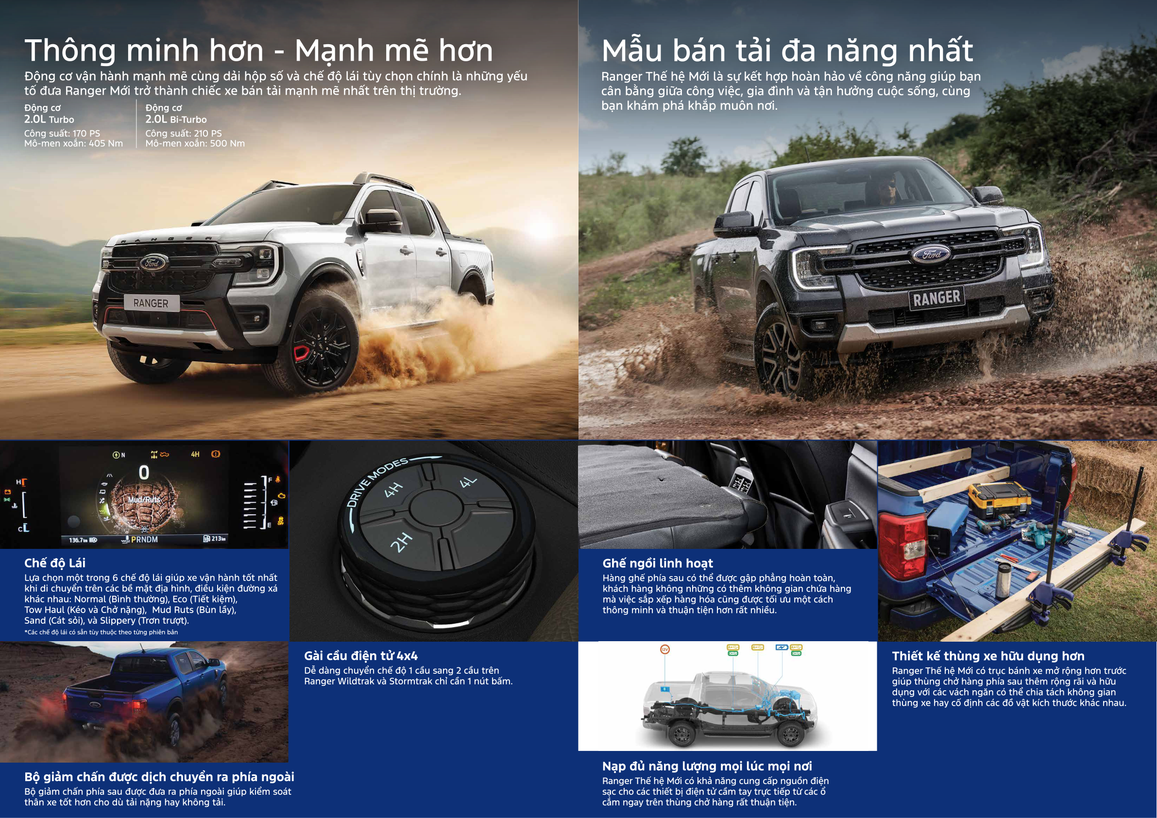 - Ranger Stormtrak 2.0L 4×4 AT – Bi-Turbo 210PS/500Nm, cần số điện tử E-Shifter